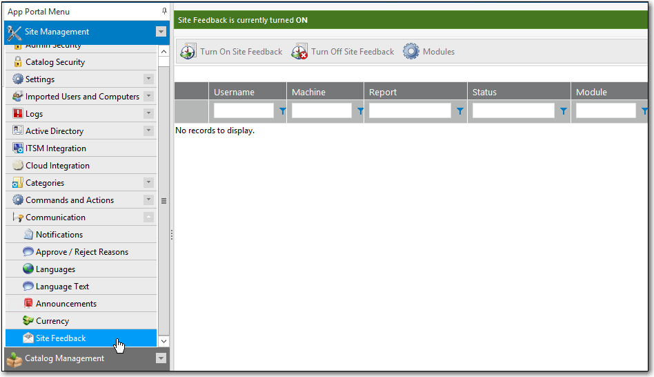 To turn on the display of the Site Feedback widget on the non-admin pages of your App Portal site, perform the following steps.