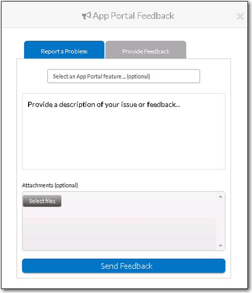 • Provide Feedback —Select this option to express an opinion on App Portal features and capabilities, or to request enhancements.