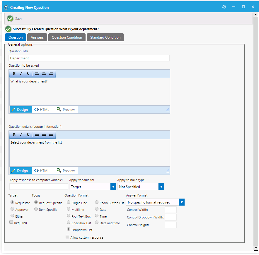 - Click Save . You are notified that the question was created successfully, and, because you selected Checkbox List , Dropdown List , or Radio Button List as the question format, the Answers tab is enabled, where you need to enter the values for the list.
