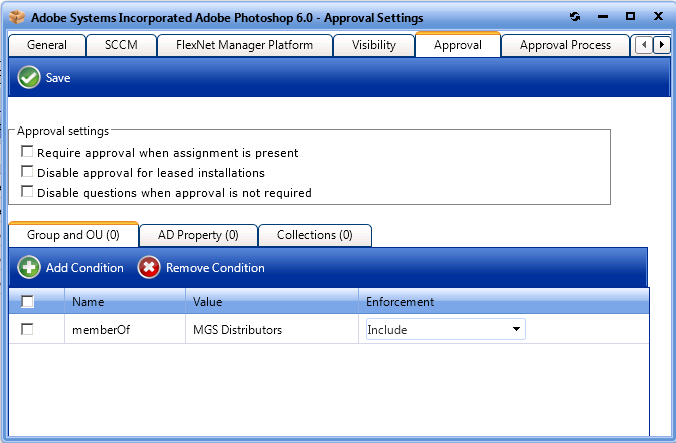 4. To create conditions—based on Active Directory Group and OU/Administrative Units , AD Property (Active Directory/Entra ID properties), and Collections/Intune Groups —that will force requests for the catalog item to go through an approval process, perform the following steps: