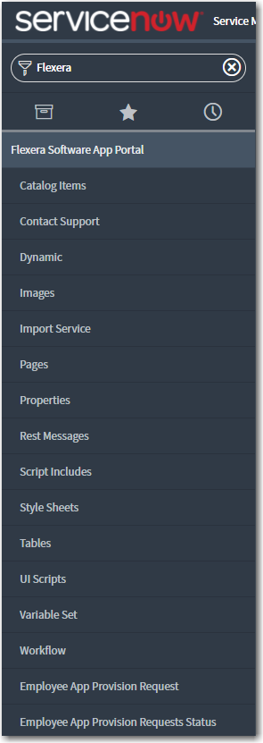 - Click Commit Update Set . As soon as the update set is committed, if you enter Flexera in the ServiceNow search box, and you will see the following new items listed in the menu: