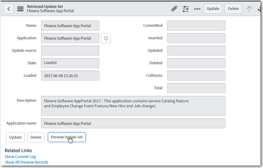 - Click Preview Update Set . After previewing the update set, if there are any errors, they will be listed at the bottom of the screen on the Update Set Preview Problems tab.
