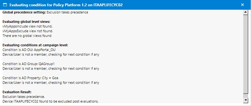 - The Is eligible for Alerts? column provides a link with Yes/No values and indicates whether the device is eligible for processing the alerts or not based on the conditions defined for that campaign. Clicking this link opens an Evaluating condition for <application name> on <device> pop-up with detailed information on eligibility as shown following: