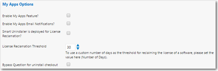 By setting My Apps options, you can specify the number of days in the license reclamation threshold, the FlexNet Manager Suite classification of applications to list on the My Apps tab, and whether to also send out email notifications to a user when an alert on the My Apps tab is generated for that user.