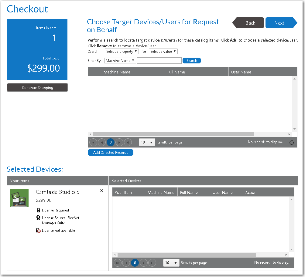 - On the Choose Target panel of the Checkout Wizard, select Search for people or computers , as described in Choosing a Target or Target Option, and click Next . The Choose Target /Users for Request On Behalf Panel panel opens.