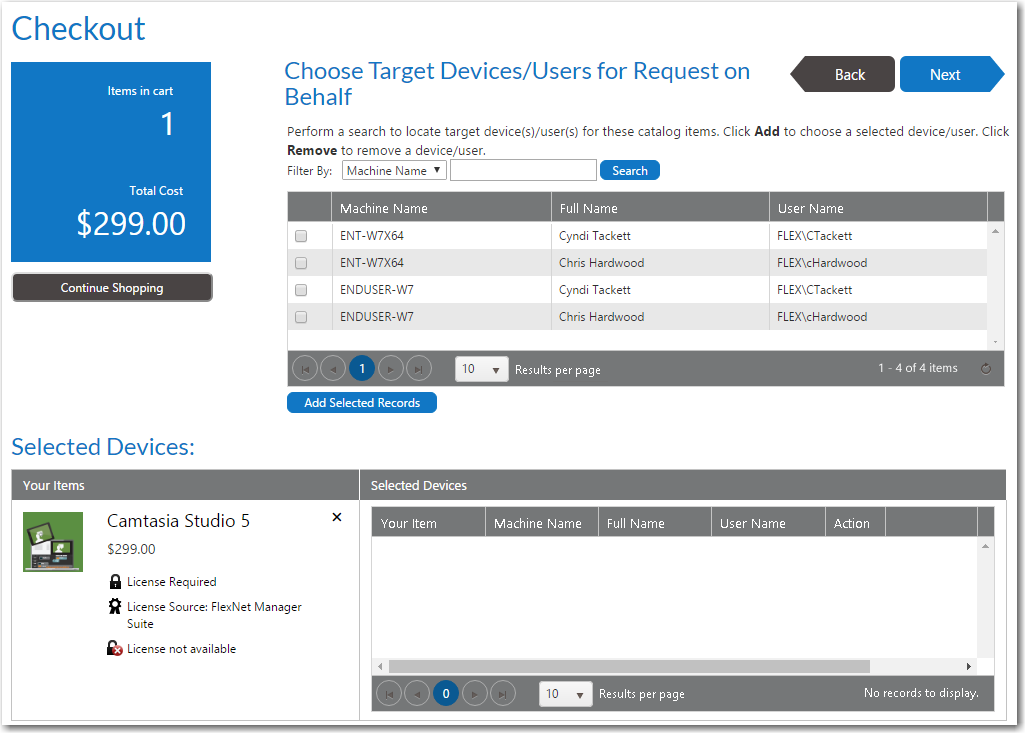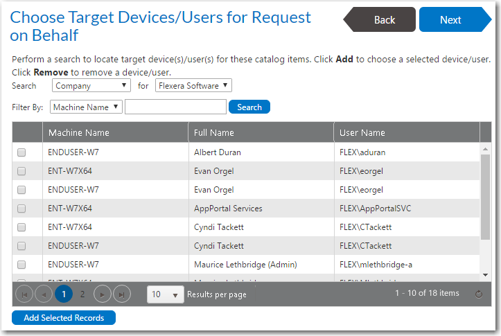 - On the Choose Target panel of the Checkout Wizard, select People who report to me , as described in Choosing a Target or Target Option, and click Next . The Choose Target /Users for Request On Behalf Panel panel opens, listing only those users who report to you.
