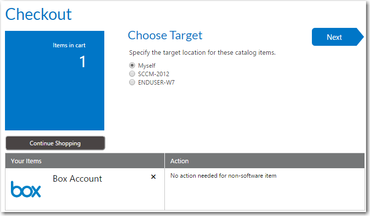 If App Portal is integrated with a cloud application (such as Box, Office 365, or Salesforce), you can request a cloud application account in the App Portal storefront on the Browse Catalog tab by checking out a cloud catalog item.